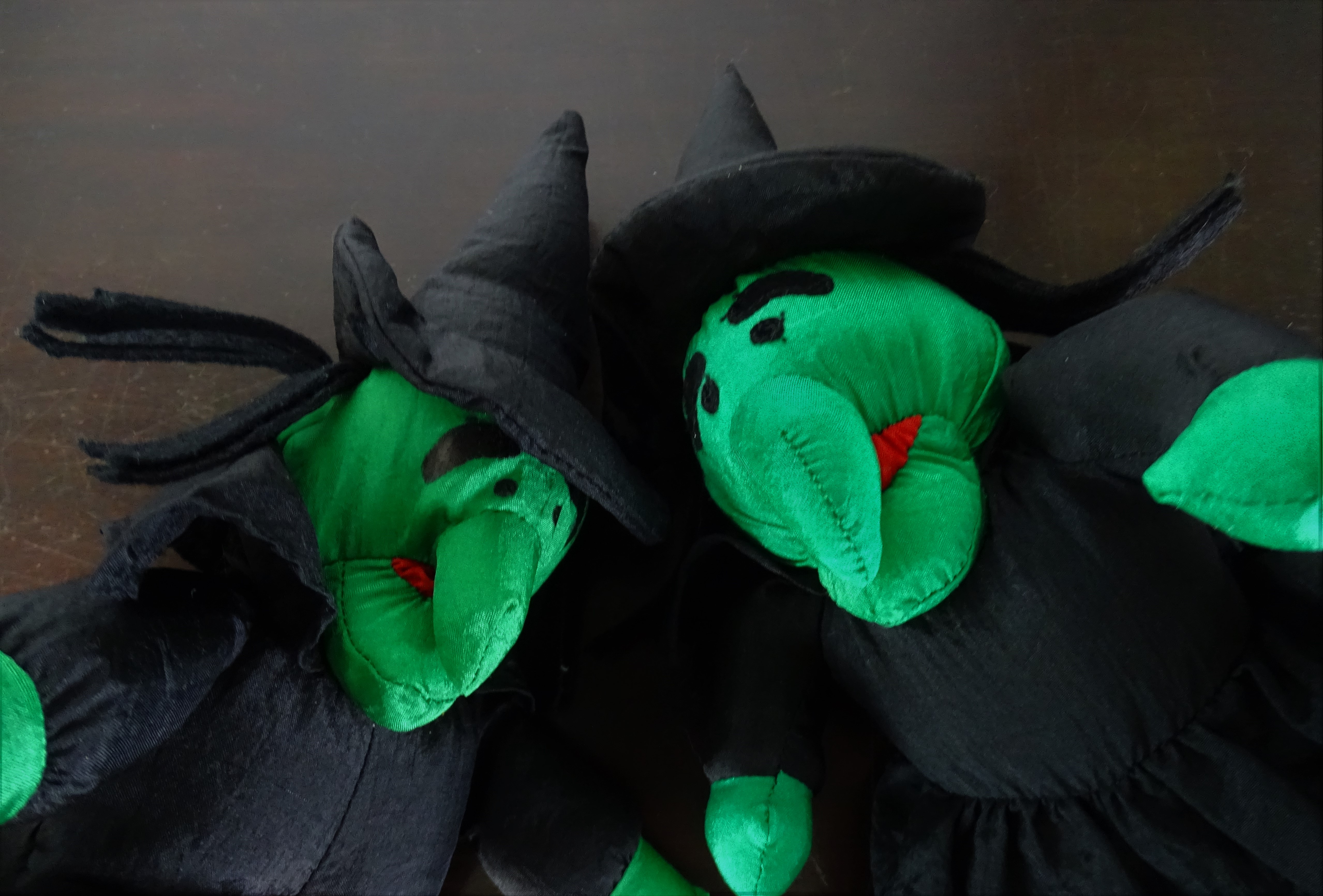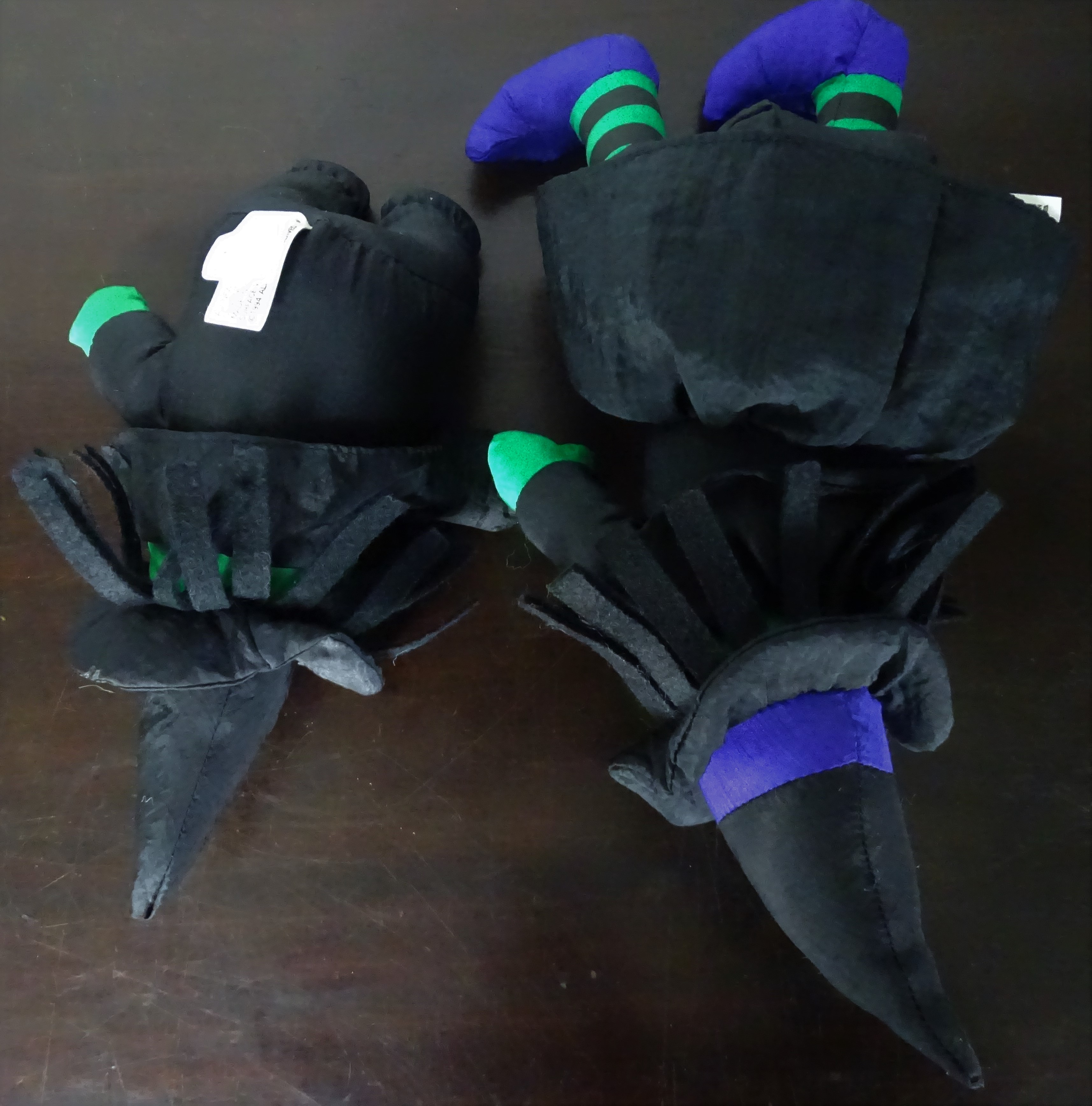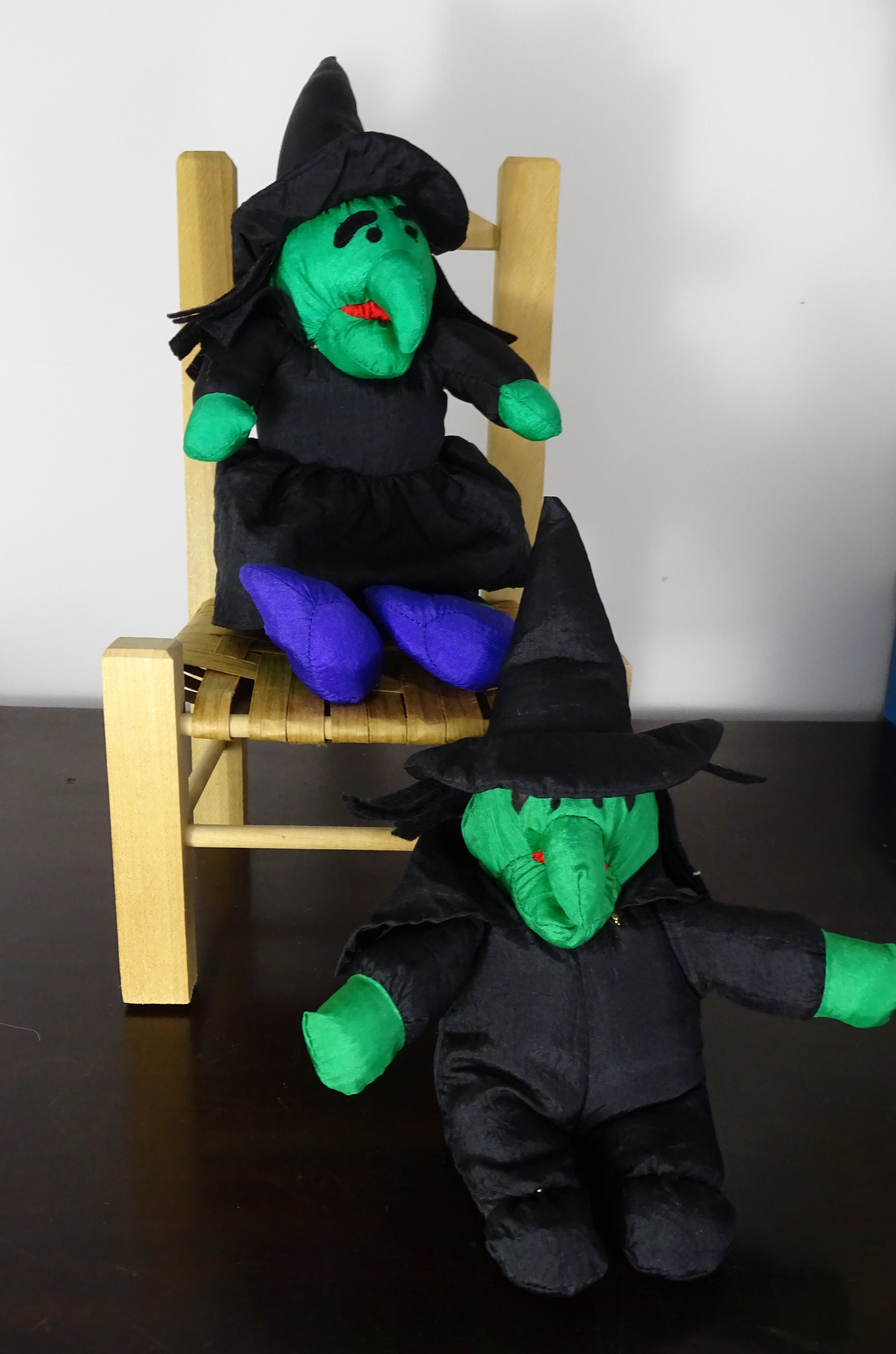 Cute set of 2 vintage stuffed witches. Wipeable black and green polyester (sometimes referred to as nylon vinyl) fabric stuffed plush in 2 different sizes. A miniature witch and big witch. One owner family piece, not abused or played with, collectibles. Big witch has striped leggins and purple witch shoes.