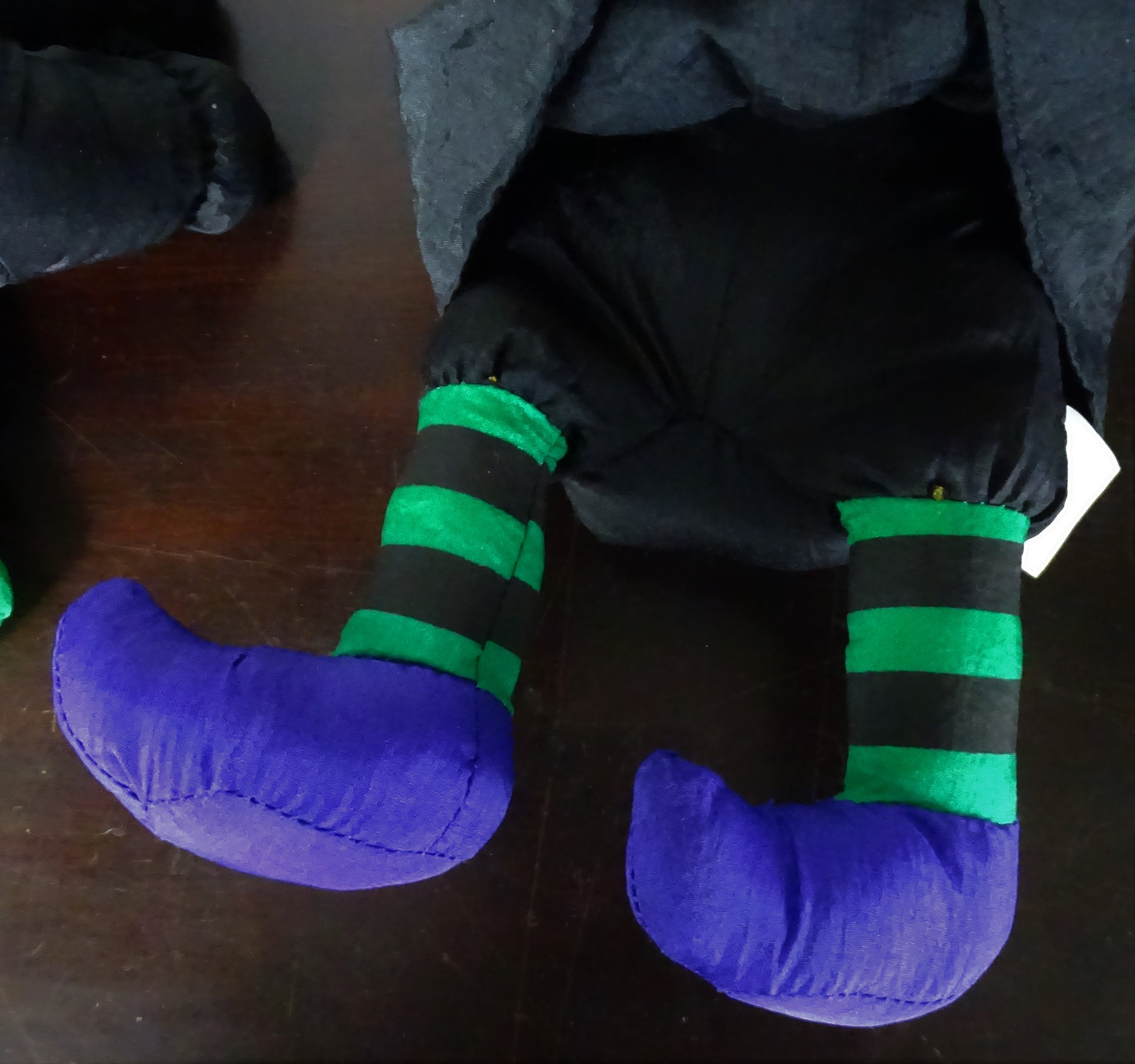 Big bad witch: approx 12" up to tip of hat, estimated to be 1990's, legs are floppy but wants to be in sitting position.