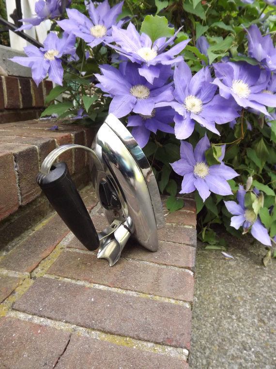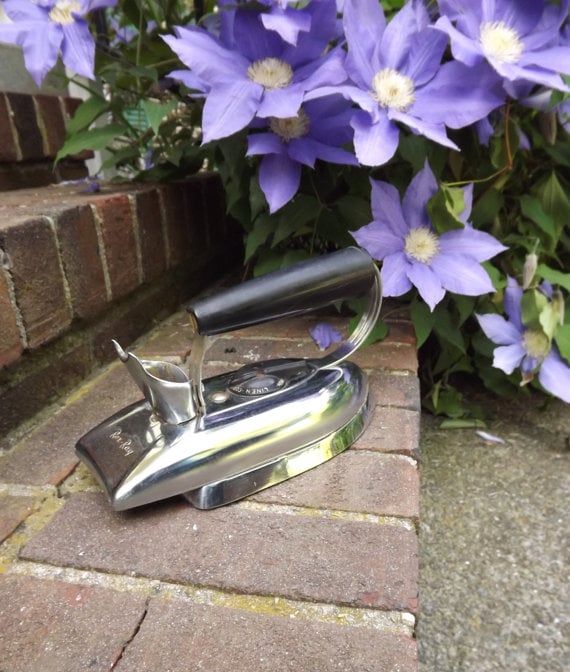 Super cool shiny silver Chrome Electric Iron by Rex Ray of Missouri, USA. Atomic era, heavy iron from the 1950s with a Bakelite handle. It would be a abfab home decor piece on a book shelf as a bookend, as a door stop or just on a shelf with your other Electric collectibles.