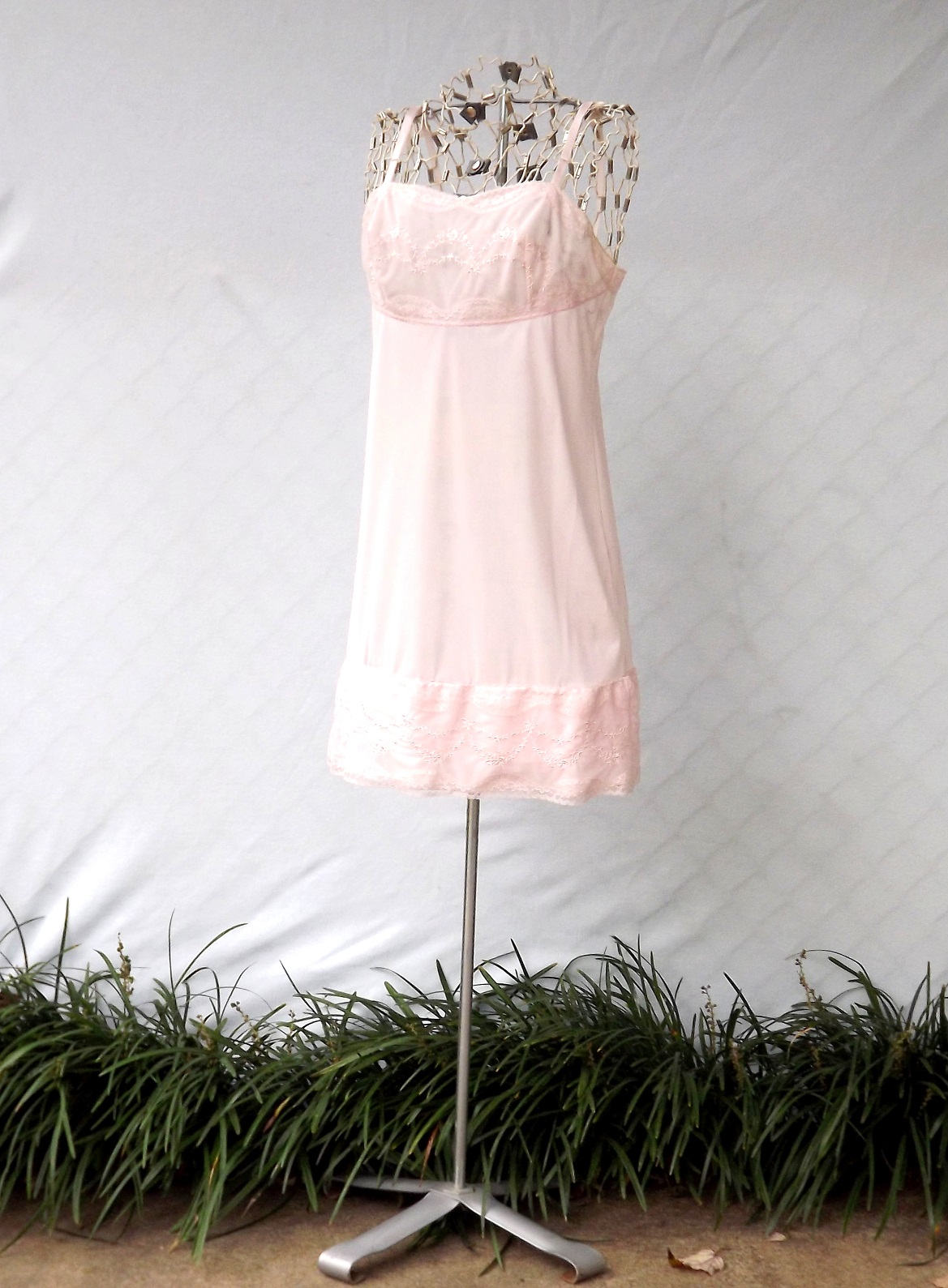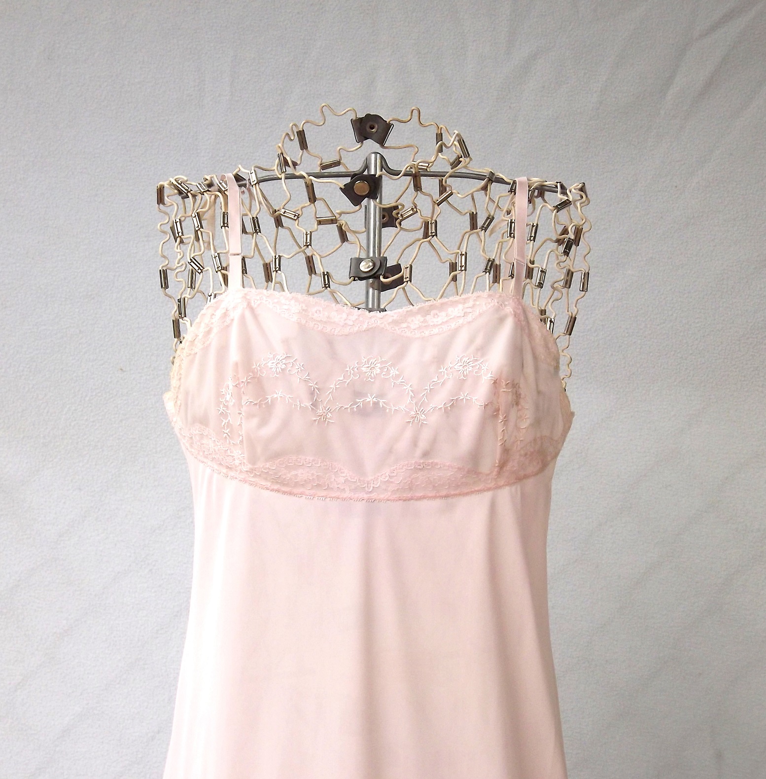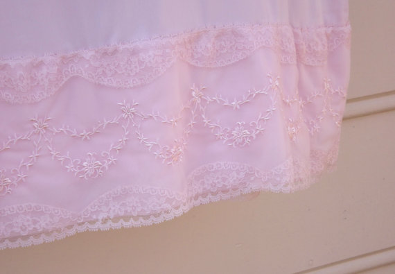 This lovely womens pale pink vintage 1960s negligee lace full slip is so unusual. The quality of this lingerie is top notch and is in pristine condition. Wide band of beautiful swags of embroidered flowers and lace at the top and bottom. Size 32c, medium. I love the straight cut top section - so unique.