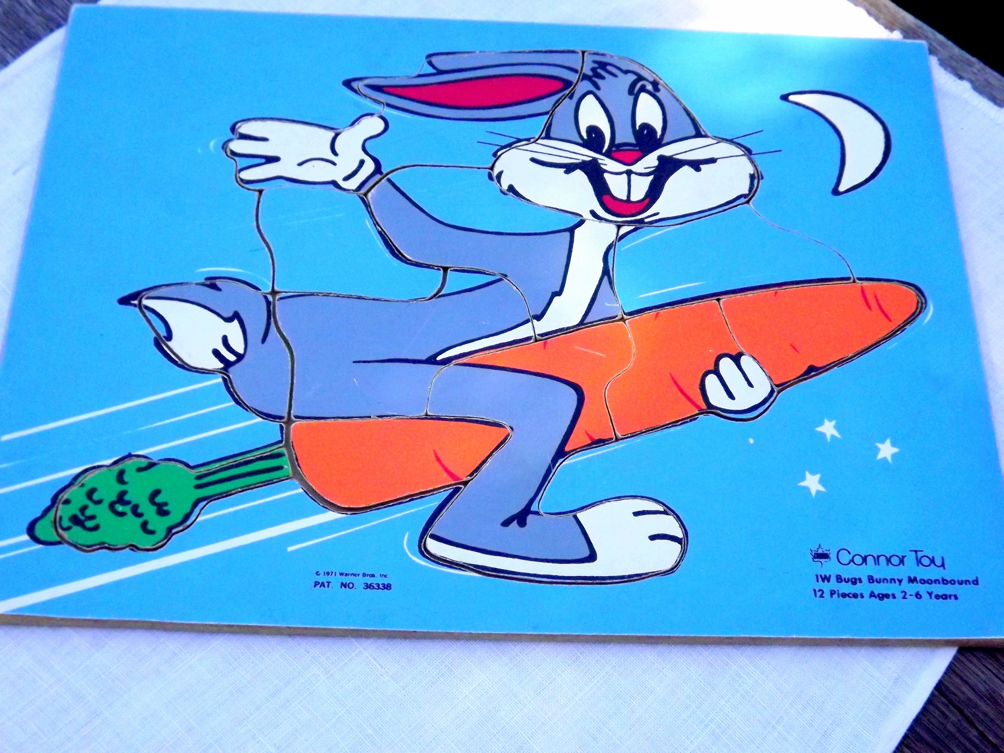 This 1971 Vintage Connor Toy Wooden Puzzle featuring Bugs Bunny riding a Carrot to the Moon is so unique. I've seen several other variations but this one is the cutest for sure!